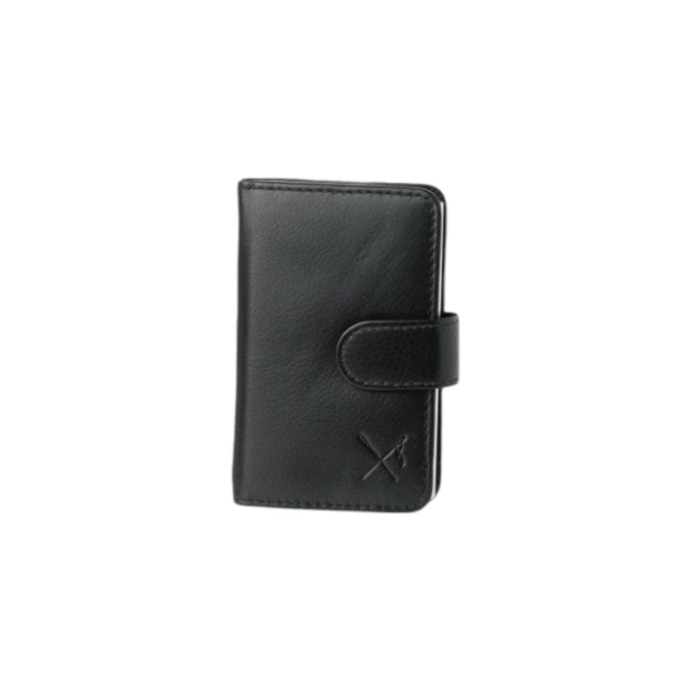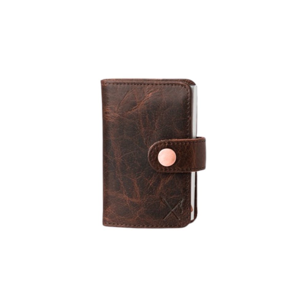 Men’s wallet made from genuine leather and crafted in Greece, featuring an integrated pop-up metal card case. Inside, it includes a small compartment for folded banknotes and two additional card slots, offering extra storage space. It closes with an external button for secure fastening and a modern look. It does not include a coin pocket.