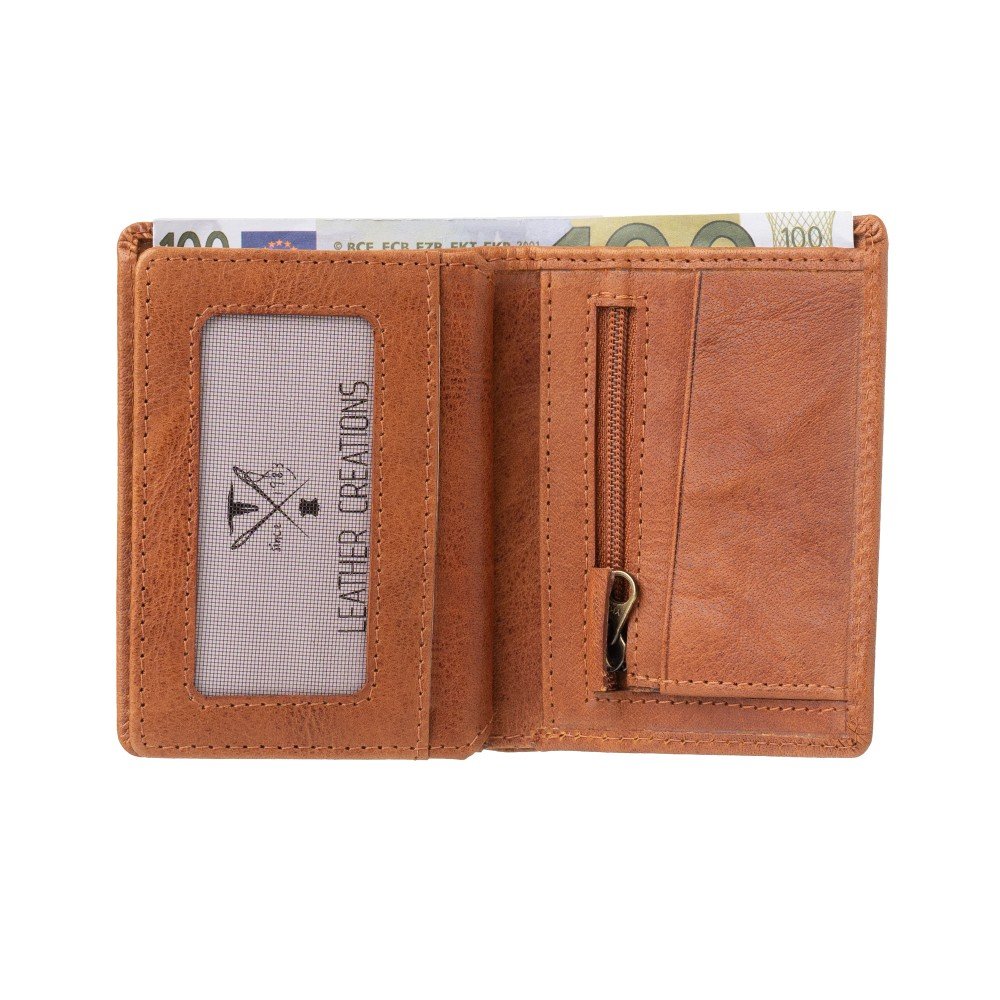 A compact leather wallet designed for maximum practicality without bulk. Inside, you will find a banknote compartment, a zippered coin pocket, and several card slots. At the center, there is an additional section with extra card slots and a transparent window for an ID card or driver’s license. Despite its small size, it holds all the essentials and fits comfortably in any pocket or bag. RFID technology protects your cards from unauthorized wireless transactions.