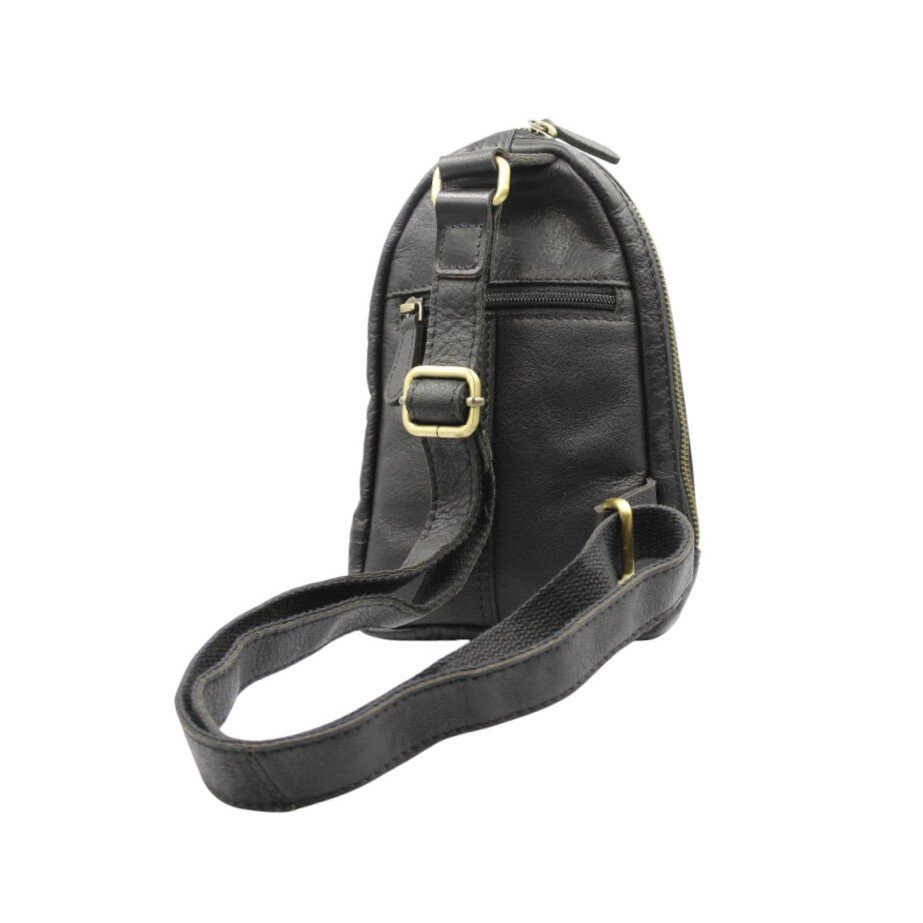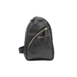 Practical leather crossbody chest bag, designed to be worn on the chest and provide easy access to personal belongings. It features a main zippered compartment on the side, along with a smaller zippered pocket on the front. Additionally, there is an extra small external pocket for items you need quick access to. On the back, it includes a zippered pocket for added security. The interior is fully lined and includes two internal slip pockets, offering improved organization.