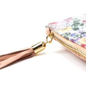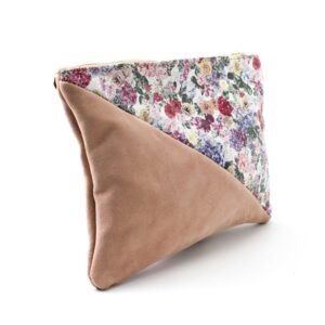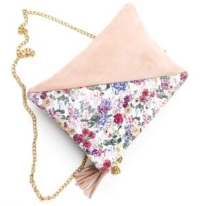 Handmade leather clutch crafted from soft suede leather in a nude pink shade. Its triangular patterns combined with floral leather details make it truly stand out. It includes a detachable chain, allowing it to be worn over the shoulder, crossbody, or carried by hand. It closes with a zipper for added security, while the decorative tassel adds an elegant touch.