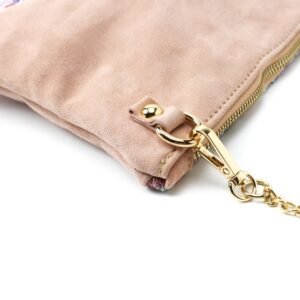 A stylish handmade leather clutch, crafted from soft suede leather in nude pink color. It features a golden leather detail at the center, adding a touch of shine and luxury. The clutch includes a detachable chain, allowing it to be worn crossbody or on the shoulder, or carried by hand depending on the occasion. It closes with a zipper for added security, while the decorative tassel adds an elegant touch. The interior is lined with cotton fabric for durability and protection of your belongings. Perfect for everyday use, as well as evening outings.