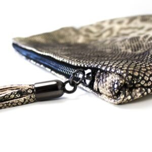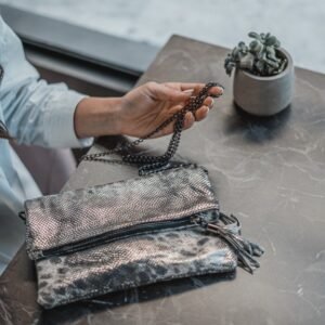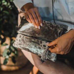 Handmade leather envelope, foldable, crafted from high-quality leather in a black and silver snake print. It can be worn crossbody using the chain, offering comfort for daily use. Alternatively, you can carry it by hand, easily removing the chain.