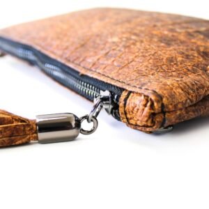 An elegant handmade leather clutch, crafted from high-quality leather in a brown shade with an embossed texture. It includes a detachable chain, offering the option to wear it crossbody or on the shoulder, or to hold it by hand, depending on the occasion. It closes with a zipper for added security, while the decorative tassel adds a stylish touch.