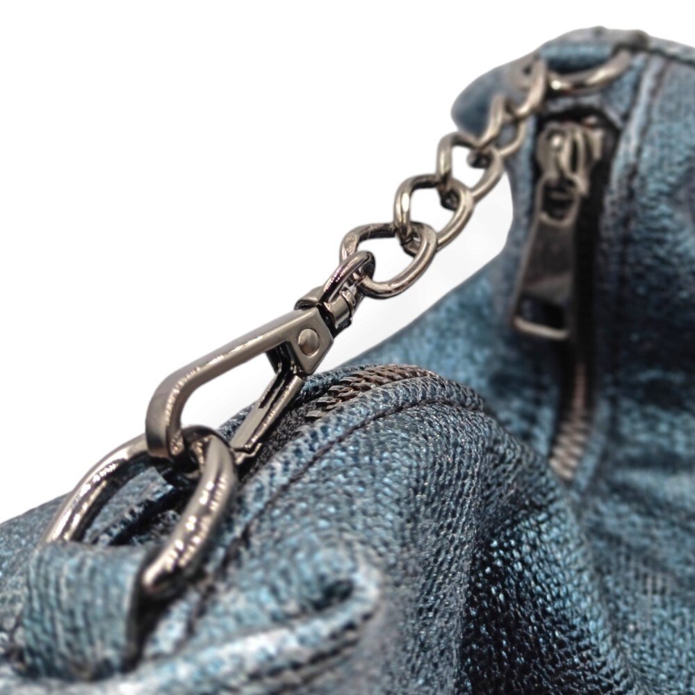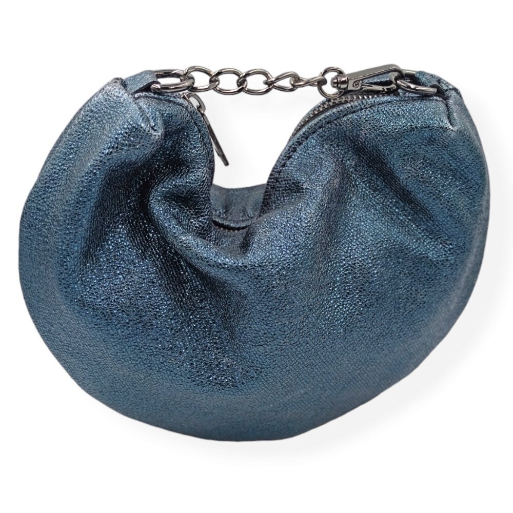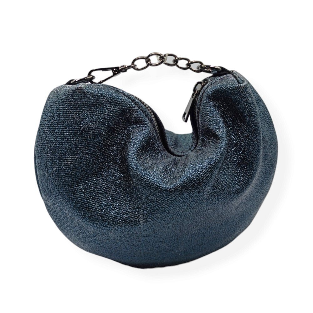 Showcase your style with this handcrafted leather clutch in a unique curved design that steals the spotlight. Its glossy leather gives it a glamorous dimension, perfect for evening occasions. It closes with a zipper for added security, while the subtle metallic chain at the edges enhances the curviness of the design. It comes with an extra long chain, ideal for wearing crossbody or carrying it on your shoulder. Inside, it is lined with cotton fabric and features a small leather pocket for added organization.
