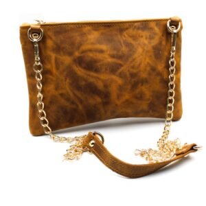 Handmade leather envelope crafted from high-quality leather in a rich brown color. It can be worn crossbody using the chain, providing comfort for daily use. Alternatively, you can easily remove the chain and carry it by hand. Inside, it is lined with cotton fabric and features a small leather pocket for added organization.