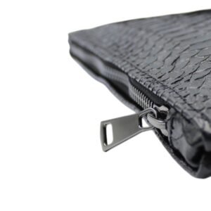 This handmade leather wristlet is crafted from genuine leather with a black embossed snake print. Its small size makes it the perfect accessory for carrying everyday essentials. It closes with a zipper for added security and comes with a detachable leather wrist strap for easy carrying. The interior is carefully lined with cotton fabric and features a small leather pocket, ideal for storing small items.