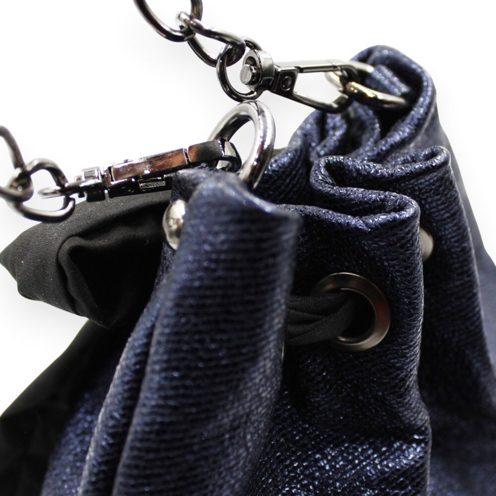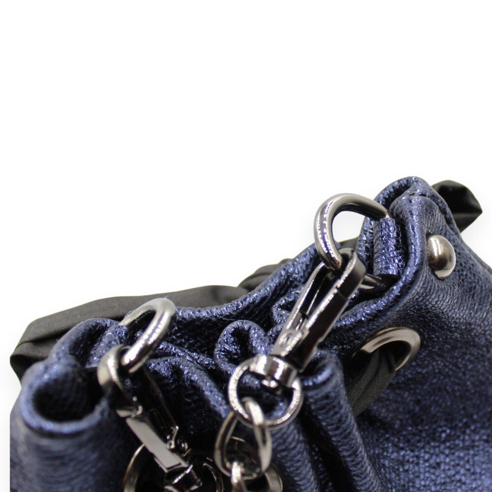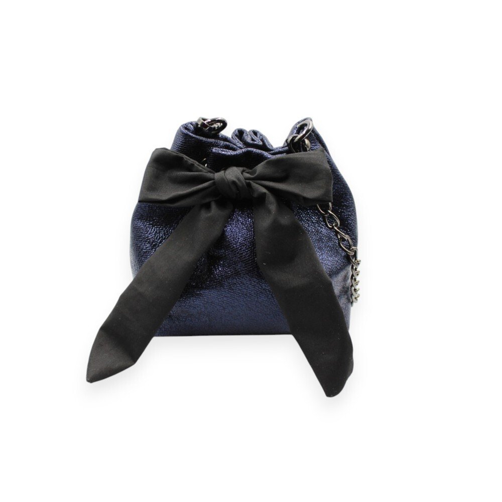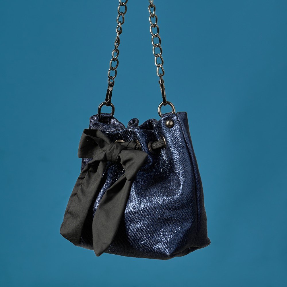 Handmade leather bucket bag crafted from genuine Italian leather in a unique metallic blue shade. It comes with 1 detachable metal chain of your choice: either a short one to carry it by hand, or a longer one to wear it on your shoulder or crossbody. The black fabric bow that decorates it adds a feminine touch that everyone loves. The pouch closes with a magnetic clasp, and the interior is lined with cotton fabric. Inside, there is a small leather pocket for better organization. Its practical size provides enough space for the essentials of your evening outing, while its design will attract all eyes.
