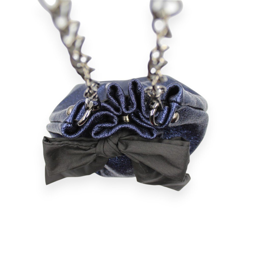 Handmade small leather pouch made from metallic blue leather. It comes with 1 detachable metal chain of your choice: either a short one to carry it by hand, or a longer one to wear it on your shoulder or crossbody. It closes with a magnetic clasp, and the elegant black bow adds a feminine touch.