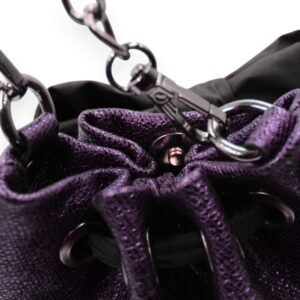 Handmade leather bucket bag crafted from genuine Italian leather in a unique metallic purple shade. It features 1 detachable metal chain of your choice: either a short one to carry it by hand, or a longer one to wear it on your shoulder or crossbody. The black fabric bow that decorates it adds a feminine touch that everyone loves. The pouch closes with a magnetic clasp, and the interior is lined with cotton fabric. Inside, there is a small leather pocket for better organization. Its practical size provides enough space for the essentials of your evening outing, while its design will attract all eyes.