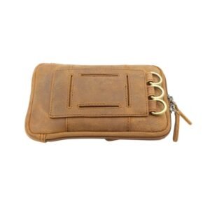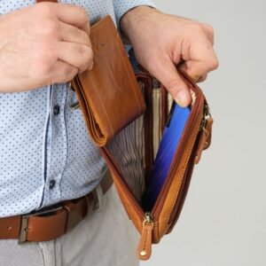 Small leather bag with a detachable crossbody strap and two belt loops on the back. It can be worn crossbody or on a belt, either vertically or horizontally, depending on your preference. The bag features one main zip-around compartment and two smaller pockets for storing small essentials.