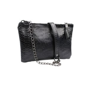 A stylish handmade leather clutch, crafted from high-quality snake-embossed leather in black. Perfect for those who appreciate modern aesthetics with a bold character. It includes a detachable chain, allowing it to be worn crossbody, on the shoulder, or carried by hand, depending on the occasion. It closes with a zipper for added security, and the decorative tassel adds an elegant touch. The interior is lined with cotton fabric and includes a small leather pocket for better organization.