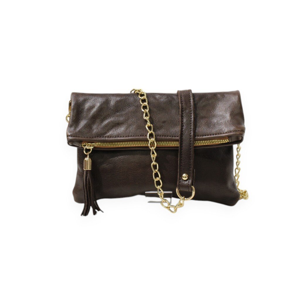 Brown leather clutch, foldover design, with a detachable chain and a decorative tassel on the zipper. It can be worn crossbody, or by removing the chain, it can be carried by hand. The interior is lined with cotton fabric and includes a small leather pocket for added organization.