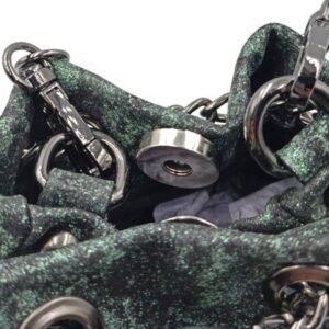 A tiny and particularly stylish handmade leather bucket bag made from genuine Italian leather in a unique green shade. It comes with 1 detachable metal chain of your choice: either a short one to carry it by hand, or a longer one to wear it on your shoulder or crossbody. It is decorated with striking chains and 2 leather tassels at the end, giving it sparkle and movement. It closes with a magnetic clasp, and the interior is lined with cotton fabric. Inside, there is a small leather pocket for extra organization. Its size is exceptionally small, fitting only the essentials, such as a key, a lipstick, and a card.