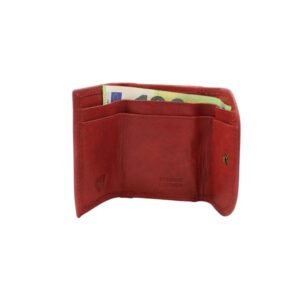 Small-sized leather wallet in red color with snap-button closure on both sides.