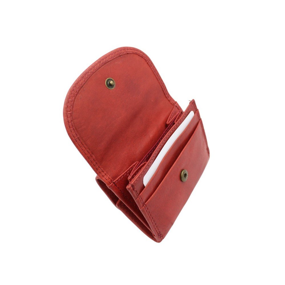 Small-sized leather wallet in red color with snap-button closure on both sides.
