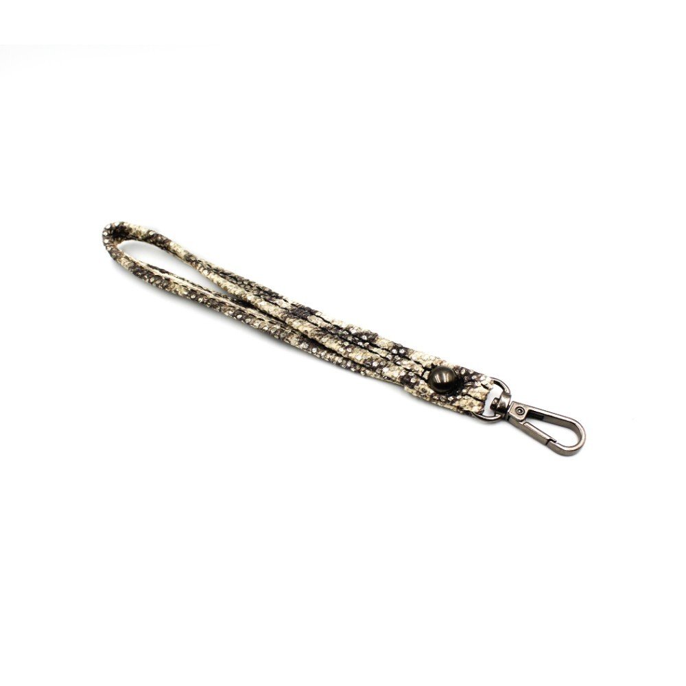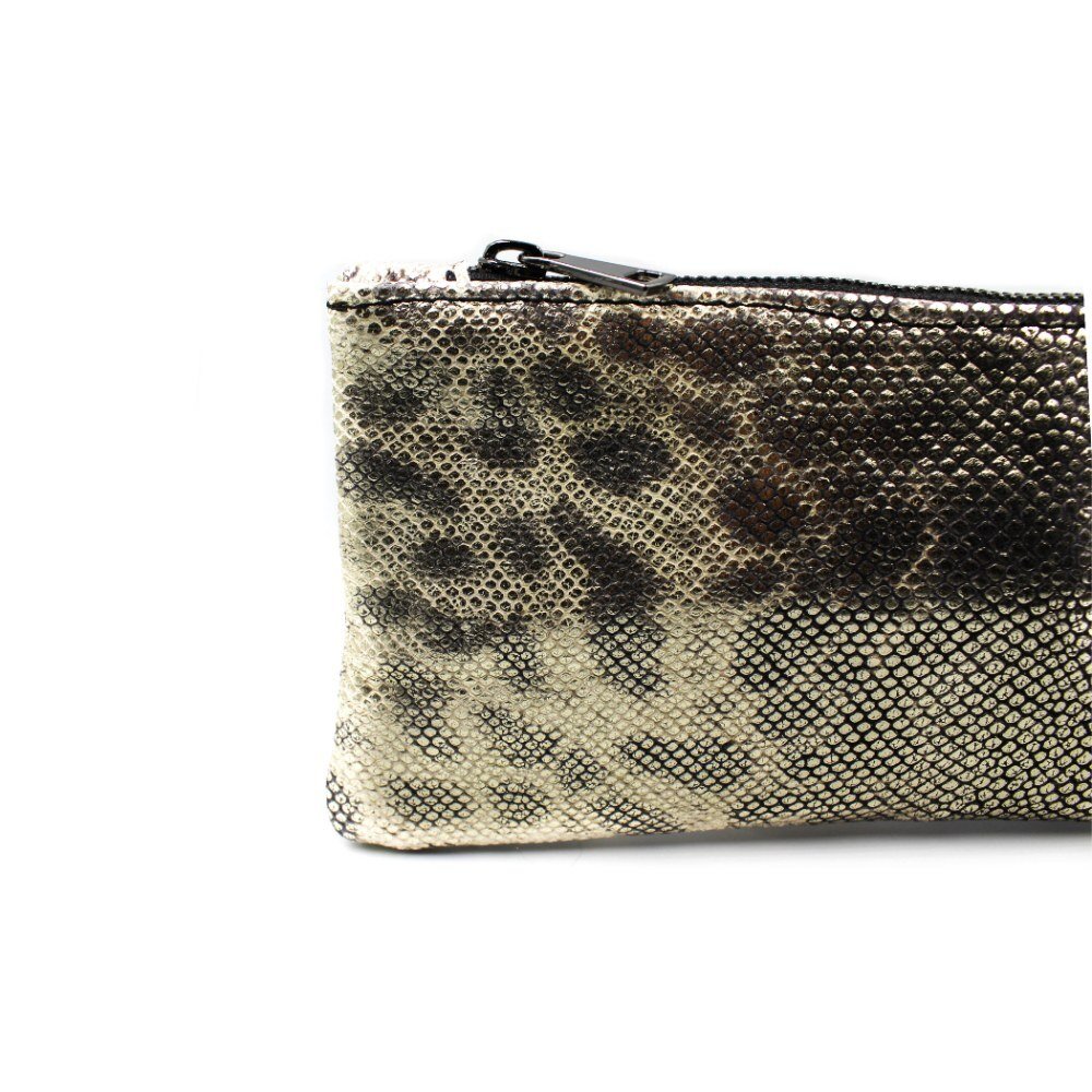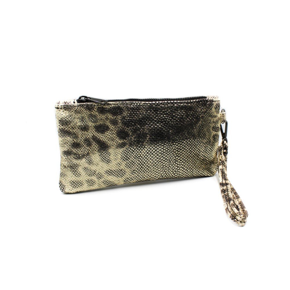 This handmade leather wrist pouch is crafted from genuine Italian leather in a silver snake print. Its small size makes it the perfect accessory for carrying everyday essentials. It closes with a zipper for added security and comes with a detachable leather wrist strap for easy carrying. The interior is carefully lined with cotton fabric and features a small leather pocket, ideal for storing small items.