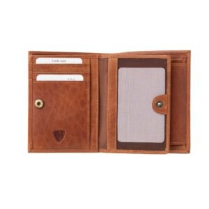 This leather wallet offers complete organization and functionality in a practical size. Made from genuine leather for long-lasting durability, it features a bill compartment, a coin pocket secured with a button, and multiple card slots. Additionally, there is an extra buttoned flap that includes additional card slots and a transparent window for an ID or driver’s license. The built-in RFID technology provides strong protection against unwanted electronic scans.