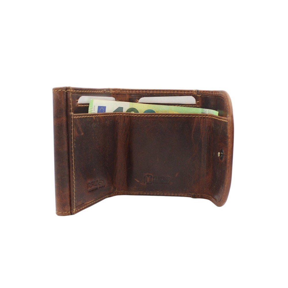 It features a secure double-button closure and includes two separate compartments. On the back, there is a banknote pocket and two card slots, while the front section offers a coin pocket plus an additional card slot. Despite its compact size, it fully meets your essential organization needs, and the RFID protection ensures your cards remain safe from unauthorized scanning.