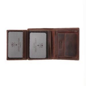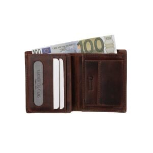 Inside, it features a double banknote compartment that allows you to separate your bills more easily. It also includes a coin pocket with a button closure and several card slots, along with an extra fold-out section that provides additional space for cards as well as transparent windows for your ID and driver’s license. The wallet is equipped with RFID protection to prevent wireless card skimming, offering greater security in your daily life.