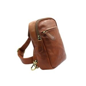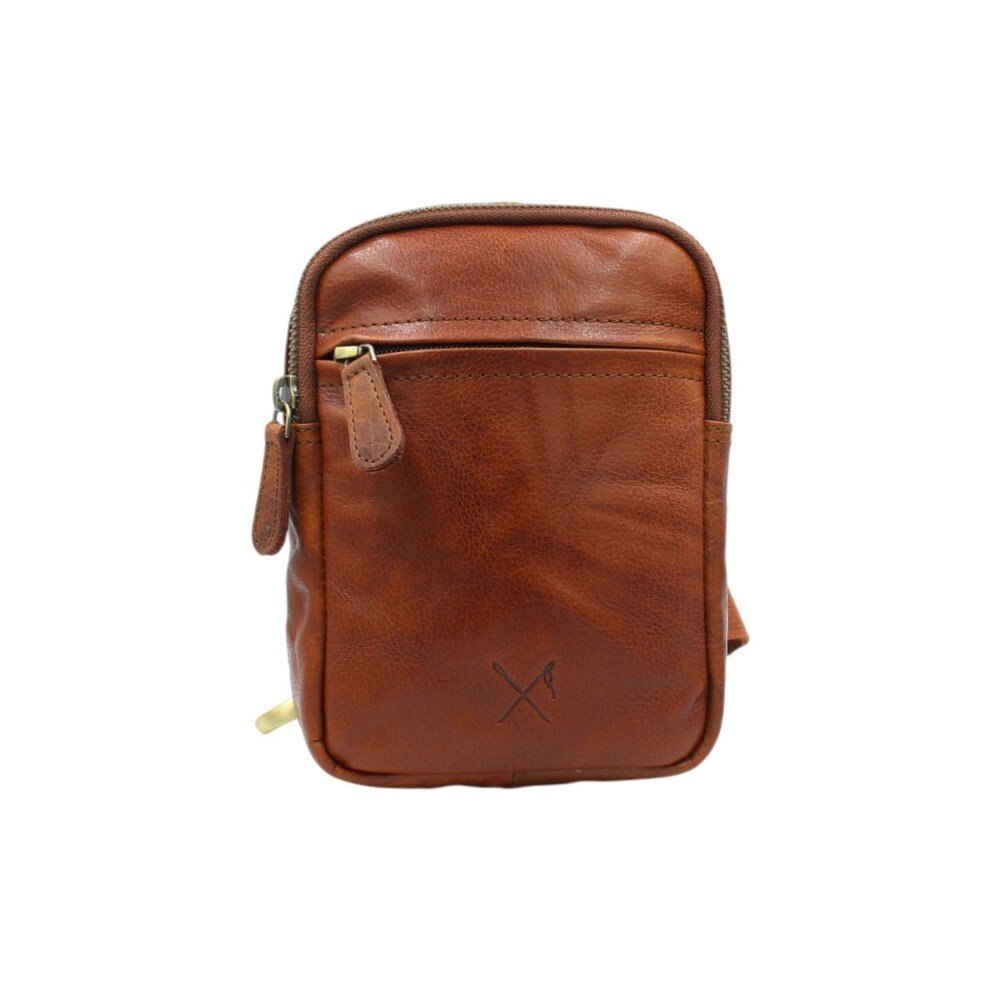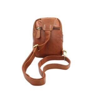 Compact leather crossbody chest bag, designed to be worn on the chest and adapt to the needs of each user. The main compartment opens with a top wraparound zipper, providing easy access and secure storage for personal items. On the front, it features a smaller zippered pocket, while the back includes an additional pocket for items that require extra protection. The interior is fully lined and includes a small organizer pocket as well as dedicated pen holders.
