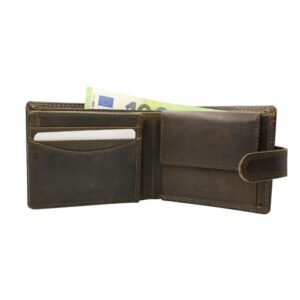 Δερμάτινο πορτοφόλι ελληνικής κατασκευής, με κομψό εξωτερικό κούμπωμα για περισσότερη ασφάλεια των πραγμάτων. Διαθέτει διπλή θήκη χαρτονομισμάτων, θήκη για κέρματα που κλείνει με κουμπί και πολλές οργανωμένες θήκες για κάρτες. Από την αριστερή εσωτερική μεριά ανοίγει επιπλέον παράθυρο με δικό του κουμπί, το οποίο προσφέρει έξτρα χώρο για κάρτες και μια διάφανη θήκη για ταυτότητα ή δίπλωμα. Ενισχυμένο με RFID προστασία για μεγαλύτερη ασφάλεια έναντι των ανεπιθύμητων ασύρματων κλοπών.