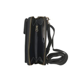 Δερμάτινο τσαντάκι μικρού μεγέθους ελληνικής κατασκευής, σχεδιασμένο για να προσφέρει πρακτικότητα με μια μόνο καθημερινή επιλογή. Διαθέτει αποσπώμενο δερμάτινο λουράκι, επιτρέποντας να φορεθεί άνετα σε χιαστί θέση, ενώ παράλληλα μπορεί να κρατηθεί και στο χέρι, ανάλογα την περίσταση. Στο μπροστινό μέρος διαθέτει ειδική θήκη για κινητό τηλέφωνο, η οποία ασφαλίζει με κουμπί, εξασφαλίζοντας άμεση πρόσβαση και προστασία. Το εσωτερικό του είναι οργανωμένο όπως ενός πορτοφολιού – έχει θήκες για κάρτες και ταυτότητα στα πλαϊνά μέρη, κεντρικό χώρισμα με φερμουάρ για νομίσματα και δύο ευρύχωρες θέσεις για χαρτονομίσματα ή αποδείξεις.
