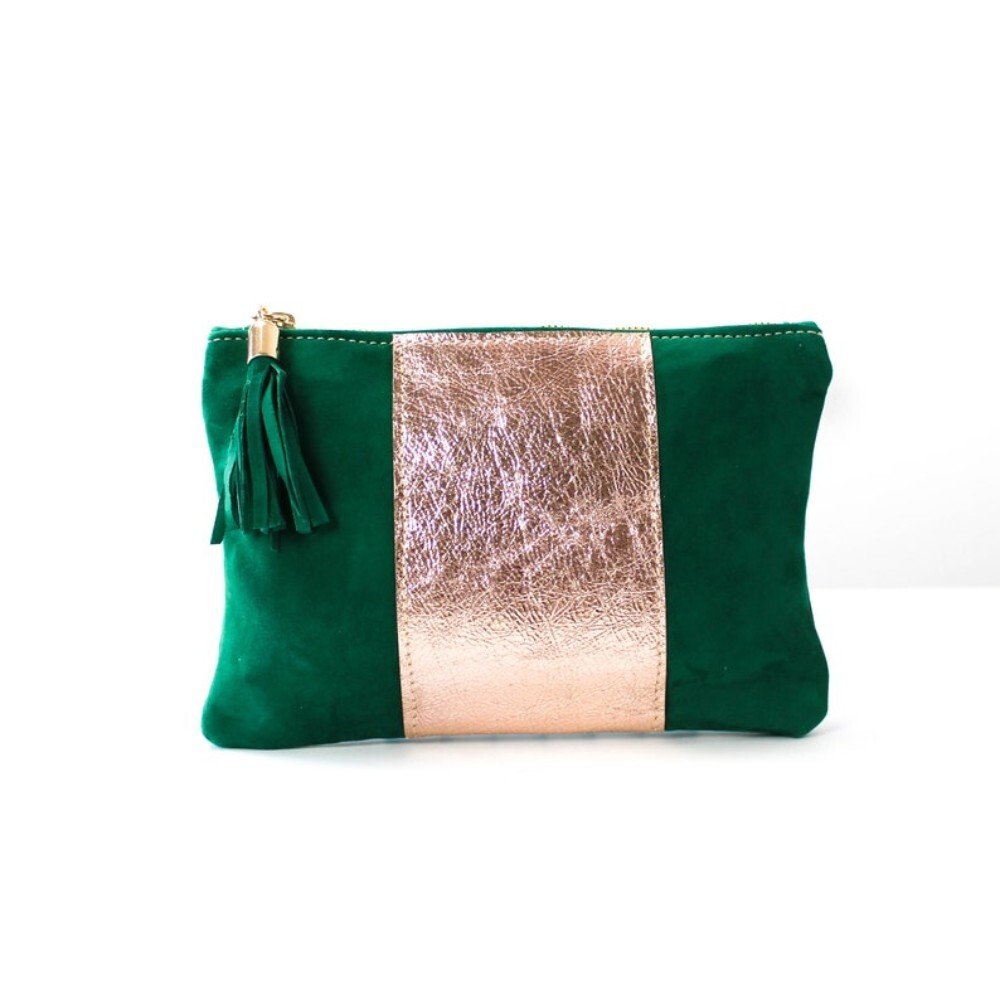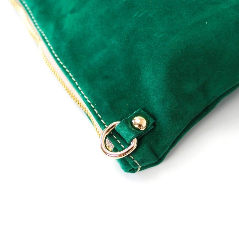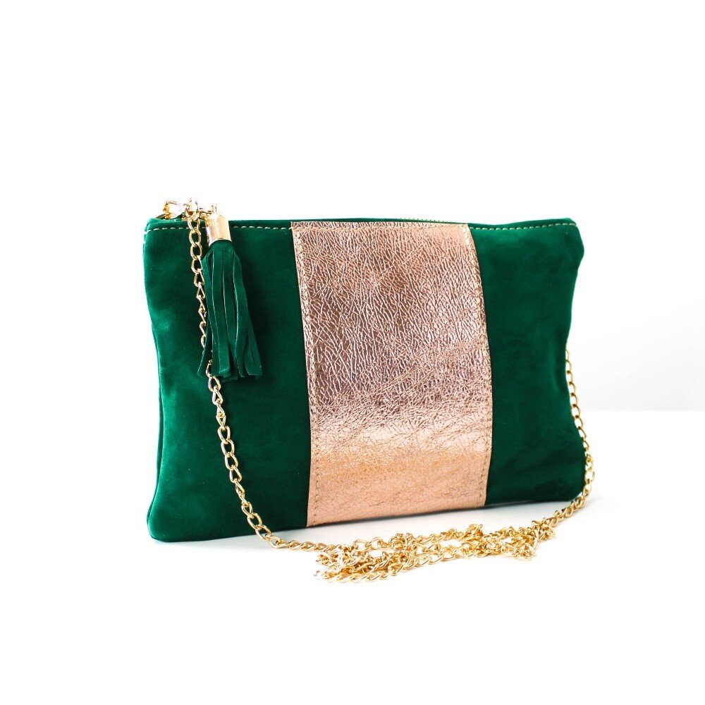 Ένας κομψός χειροποίητος δερμάτινος φάκελος, κατασκευασμένος από μαλακό suede δέρμα σε βαθύ πράσινο χρώμα. Διαθέτει μια χρυσή δερμάτινη λεπτομέρεια στο κέντρο που του χαρίζει λάμψη και πολυτέλεια. Περιλαμβάνει αποσπώμενη αλυσίδα, προσφέροντας τη δυνατότητα να φορεθεί χιαστί και στον ώμο ή να κρατηθεί στο χέρι, ανάλογα την περίσταση. Εσωτερικά είναι επενδυμένος με βαμβακερή ύφασμα για αντοχή και προστασία των αντικειμένων σας.