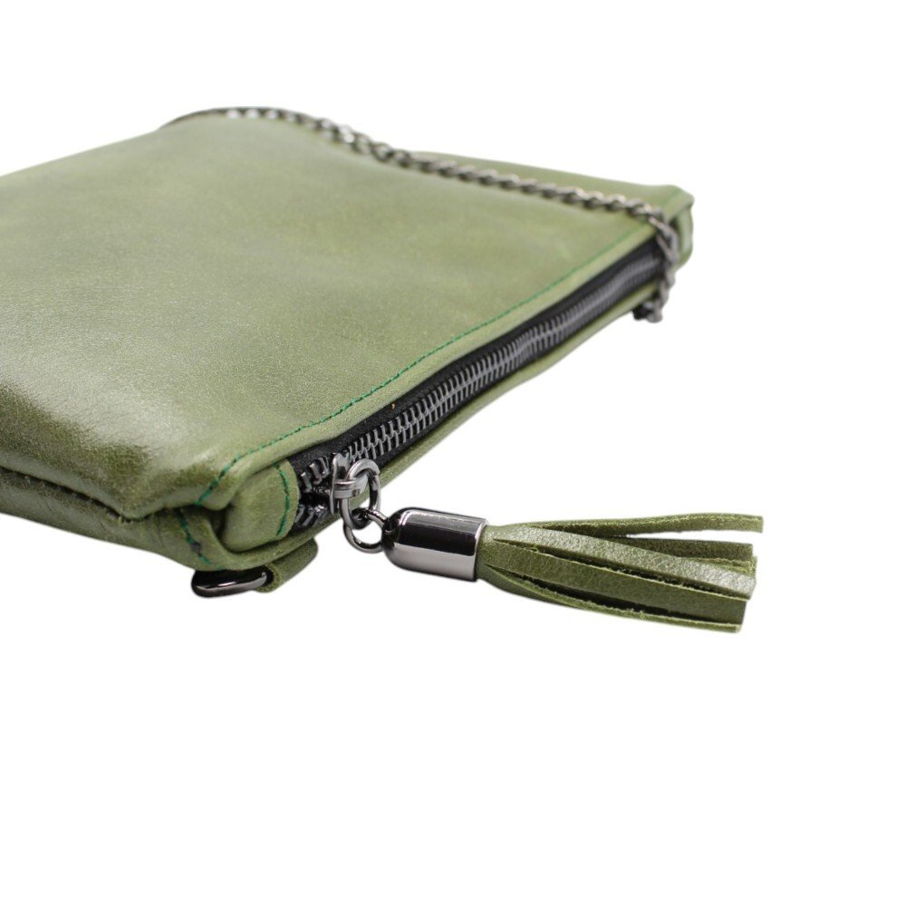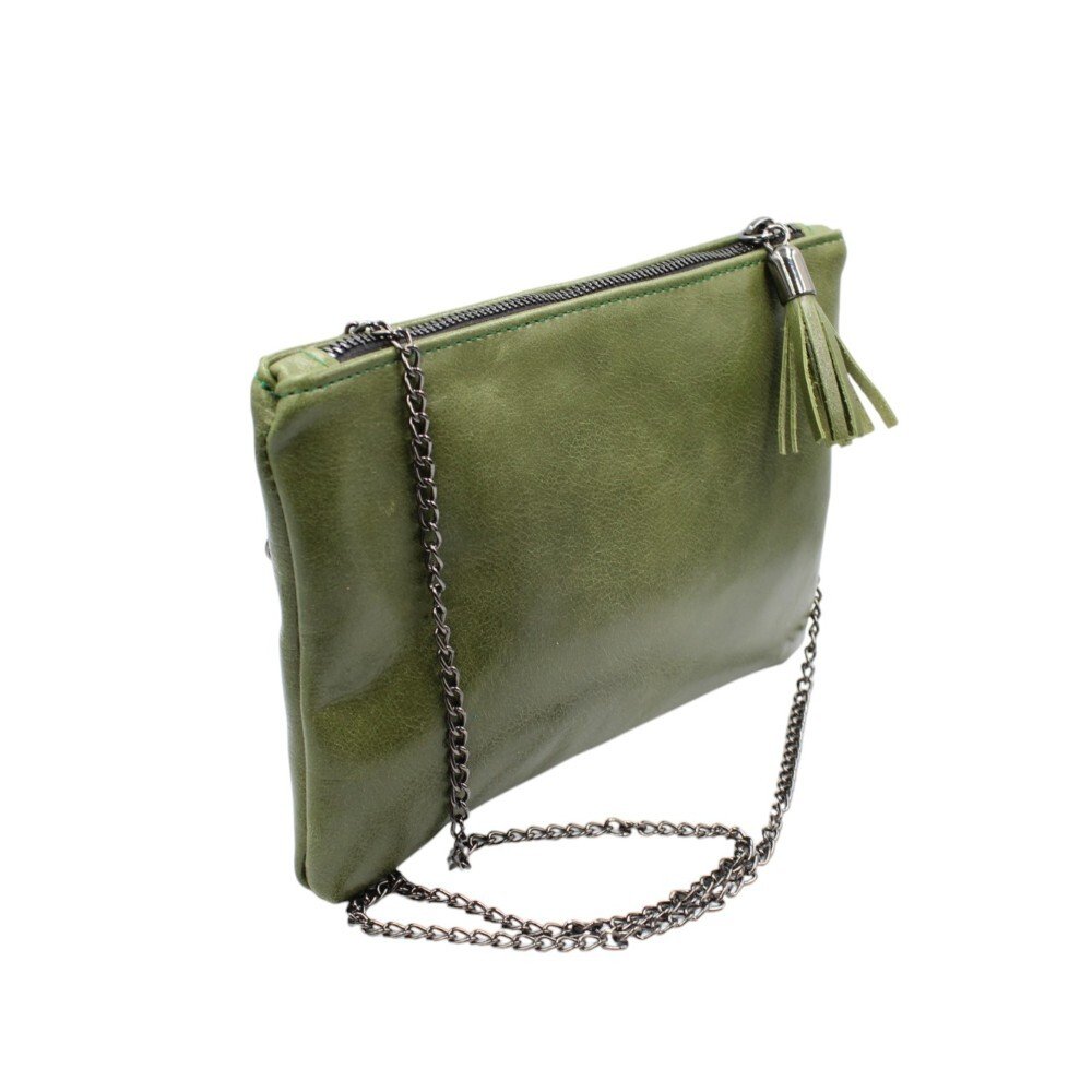 Ένας κομψός χειροποίητος δερμάτινος φάκελος, κατασκευασμένος από υψηλής ποιότητας δέρμα σε πράσινο χρώμα. Περιλαμβάνει αποσπώμενη αλυσίδα, προσφέροντας τη δυνατότητα να φορεθεί χιαστί και στον ώμο ή να κρατηθεί στο χέρι, ανάλογα την περίσταση. Κλείνει με φερμουάρ για περισσότερη ασφάλεια, ενώ η διακοσμητική φούντα προσθέτει μια κομψή πινελιά.