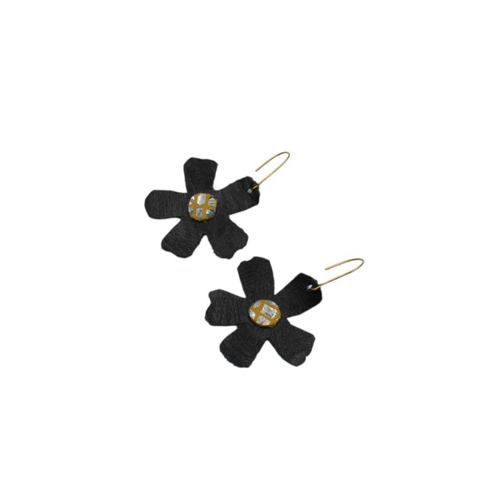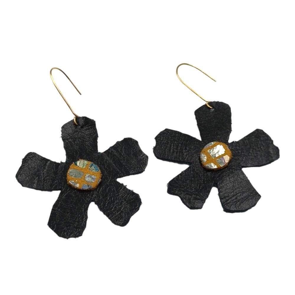 Αναδείξτε το στυλ σας με αυτά τα χειροποίητα δερμάτινα σκουλαρίκια σε λουλουδένιο σχέδιο. Είναι κατασκευασμένα στο χέρι απο μαύρο δέρμα αρίστης ποιότητας, ενώ η λεπτομέρεια στο κέντρο σε ζεστές αποχρώσεις, τα καθιστούν μοναδικά και πρωτότυπα. Το μεταλλικό κούμπωμα που διαθέτουν είναι από ανοξείδωτο ατσάλι, εξασφαλίζοντας αντοχή στο χρόνο, άνεση και χωρίς να προκαλεί αλλεργίες.