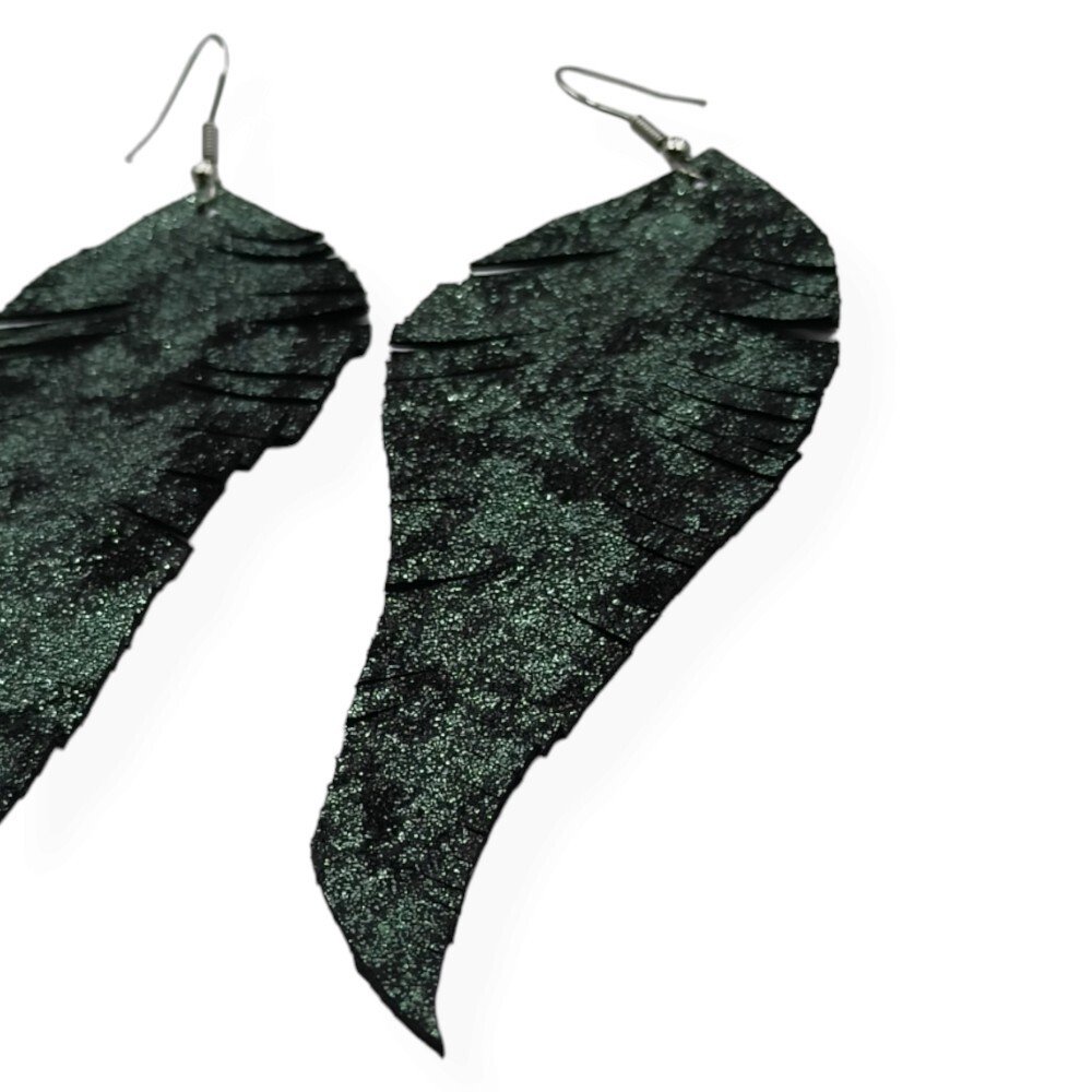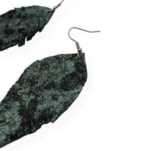 Τα δερμάτινα αυτά σκουλαρίκια είναι κατασκευασμένα από μαλακό δέρμα άριστης ποιότητας και έχουν ένα ακανόνιστο σχήμα φύλλου σε ένα βαθύ ιριδίζον πράσινο χρώμα. Τα φύλλα έχουν διακριτικές χαράξεις που αναδεικνύουν τις φυσικές λεπτομέρειες και τη μοναδικότητα μιας χειροποίητης δημιουργίας. Το κούμπωμα τους είναι απο ανοξείδωτο ατσάλι, εξασφαλίζοντας αντοχή στο χρόνο και άνετη εφαρμογή σε πολύωρη χρήση.