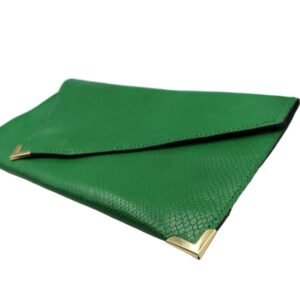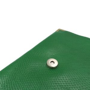 Αυτός ο εντυπωσιακός φάκελος σε ανοιχτό πράσινο χρώμα είναι φτιαγμένος από υψηλής ποιότητας μαλακό δέρμα, δίνοντας του μια αίσθηση πολυτέλειας και κομψότητας. Το γεωμετρικό του σχέδιο και οι μεταλλικές λεπτομέρειες στις γωνίες προσθέτουν έναν αέρα μοντέρνας αισθητικής.