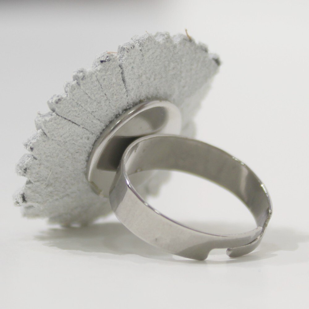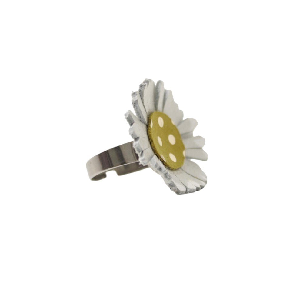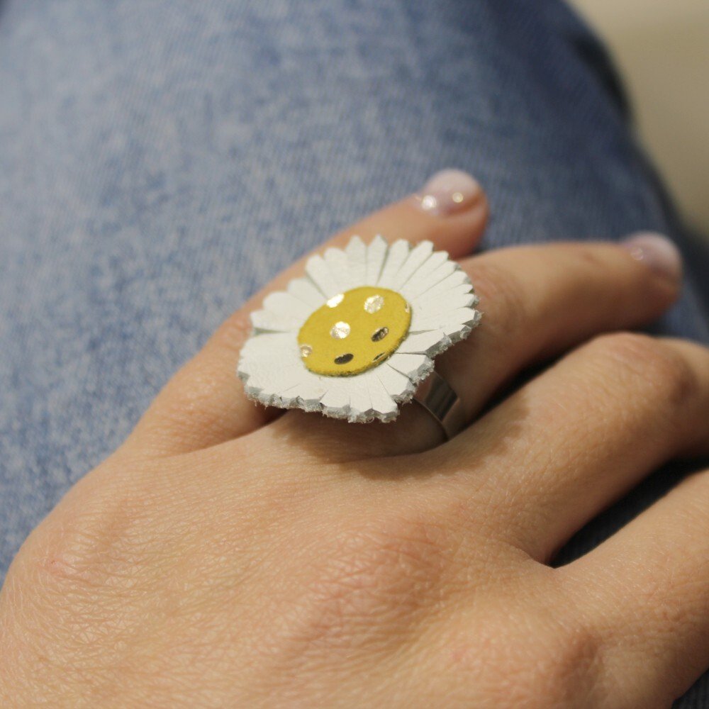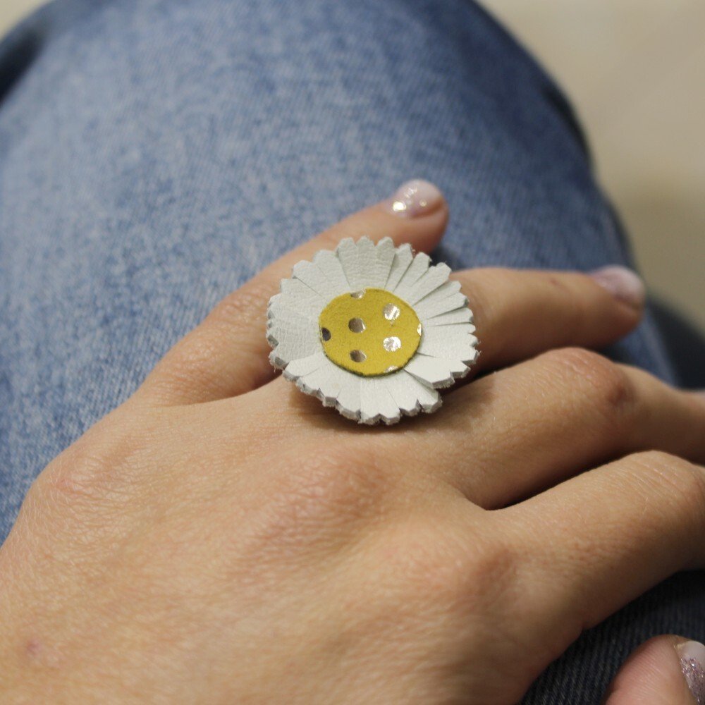 Ένα μοναδικό χειροποίητο δερμάτινο δαχτυλίδι, σχεδιασμένο σε σχήμα μαργαρίτας σε άσπρο χρώμα. Η κίτρινη λεπτομέρεια και τα προσεκτικά κομμένα πέταλα προσδίδουν φυσική ομορφιά και κομψότητα. Η βάση του είναι από ανοξείδωτο ατσάλι, εξασφαλίζοντας αντοχή στο χρόνο και αποφυγή αλλεργιών, ενώ είναι ρυθμιζόμενη για να εφαρμόζει τέλεια σε κάθε δάχτυλο.