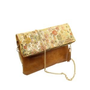 Χειροποίητος δερμάτινος φάκελος σε ταμπά χρώμα με το επάνω μέρος να ξεχωρίζει σε απαλό κίτρινο τόνο διακοσμημένο με διακριτικό μοτίβο λουλουδιών. Έχει αναδιπλούμενο σχέδιο, αποσπώμενη αλυσίδα και διακοσμητική φούντα στο φερμουάρ. Μπορεί να φορεθεί στον ώμο ή χιαστί, ενώ αφαιρώντας την αλυσίδα, μπορεί να κρατηθεί στο χέρι. Το εσωτερικό του είναι επενδεδυμένο με βαμβακερό ύφασμα και διαθέτει μια μικρή δερμάτινη θήκη για επιπλέον οργάνωση.