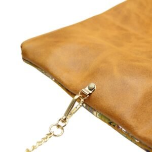 Χειροποίητος δερμάτινος φάκελος, με αναδιπλούμενο σχέδιο, κατασκευασμένος από δέρμα υψηλής ποιότητας σε ταμπά χρώμα για τη βάση και απαλό κίτρινο με διακριτικά τυπωμένα λουλούδια στο επάνω μέρος. Μπορεί να φορεθεί χιαστί χρησιμοποιώντας την αλυσίδα, προσφέροντας άνεση στην καθημερινότητα. Εναλλακτικά, μπορείτε εύκολα να αφαιρέσετε την αλυσίδα και να τον κρατήσετε στο χέρι.