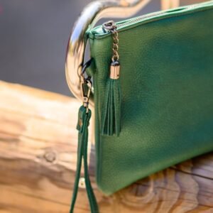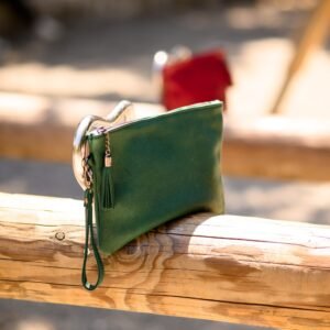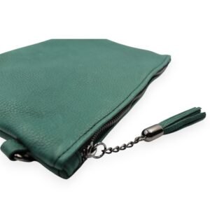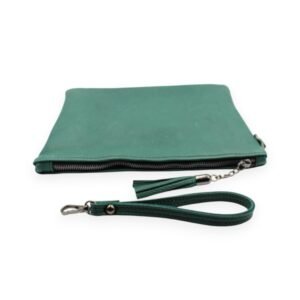Κομψός δερμάτινος φάκελος σε βαθύ πράσινο χρώμα, ιδανικός για καθημερινές και πιο ιδιαίτερες εμφανίσεις. Διαθέτει δερμάτινο αποσπώμενο λουράκι καρπού για εύκολη μεταφορά, μεταλλικό φερμουάρ για περισσότερη ασφάλεια και διακοσμητική φούντα. Το εσωτερικό του είναι επενδυμένο με βαμβακερή φόδρα, προσφέροντας μια απαλή αίσθηση και επιπλέον προστασία στα προσωπικά σας αντικείμενα, ενώ διαθέτει και μια μικρή εσωτερική θήκη για καλύτερη οργάνωση.