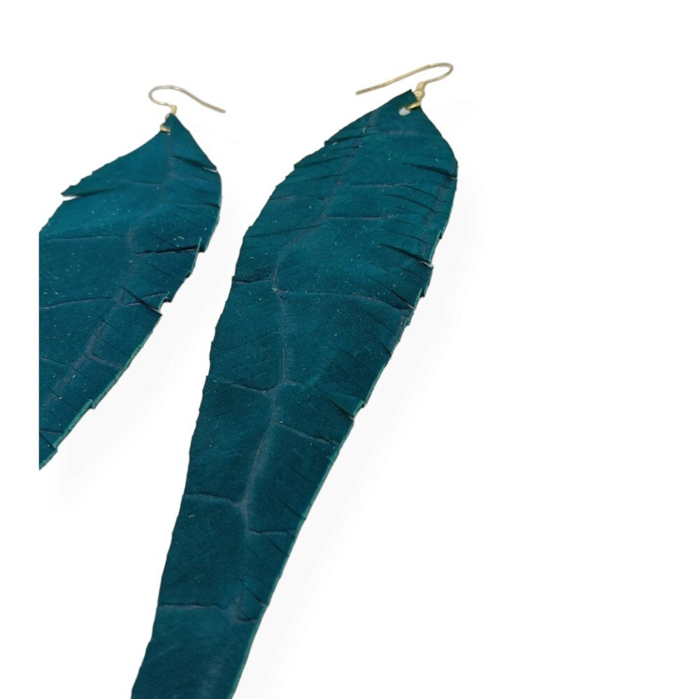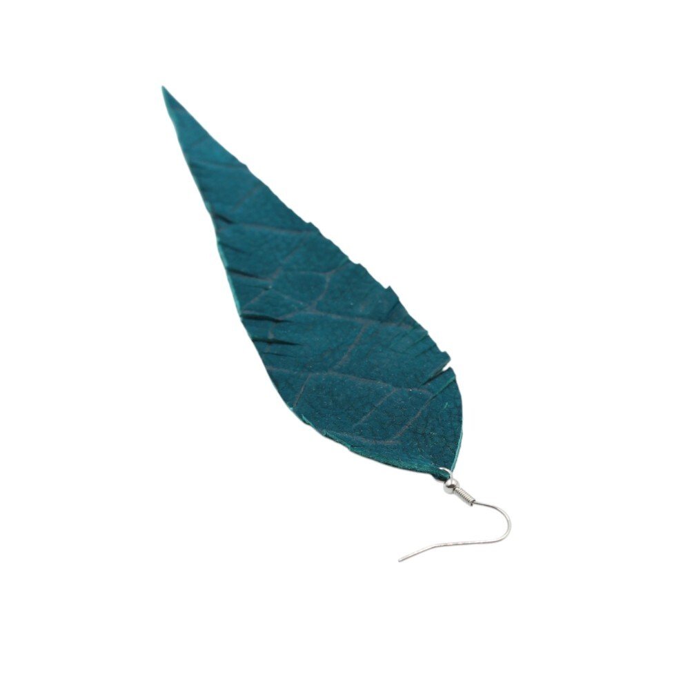 Χειροποίητα δερμάτινα μακριά σκουλαρίκια σε σχήμα φύλλου κατασκευασμένα από μαλακό δέρμα αρίστης ποιότητας στο πράσινο χρώμα της μέντας. Οι διακριτικές χειροποίητες εγκοπές προσδίδουν μια ιδαίτερη υφή και κάνουν κάθε ζευγάρι μοναδικό. Τα μεταλλικά στοιχεία είναι από ανοξείδωτο ατσάλι, εξασφαλίζοντας ανθεκτικότητα στο χρόνο και υποαλλεργική χρήση. Το ελαφρύ τους βάρος τα καθιστά ιδανικά για άνετη καθημερινή χρήση.