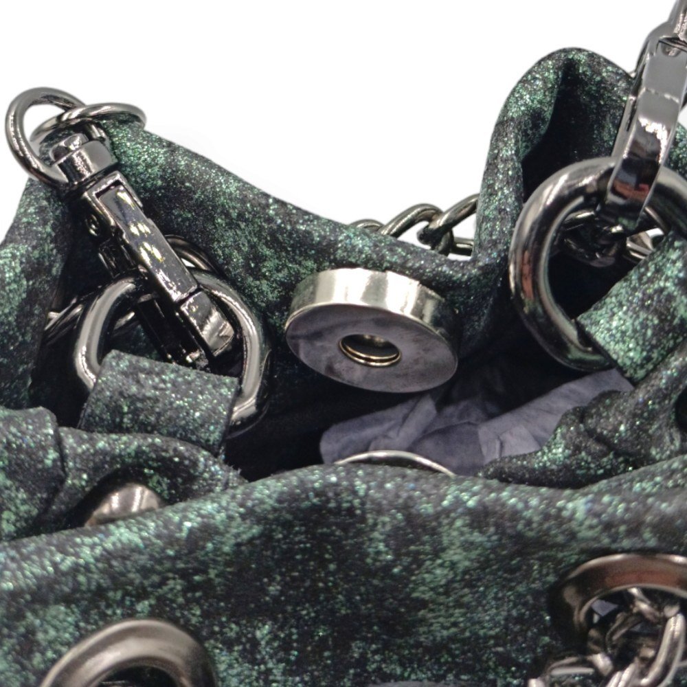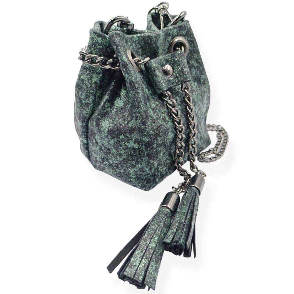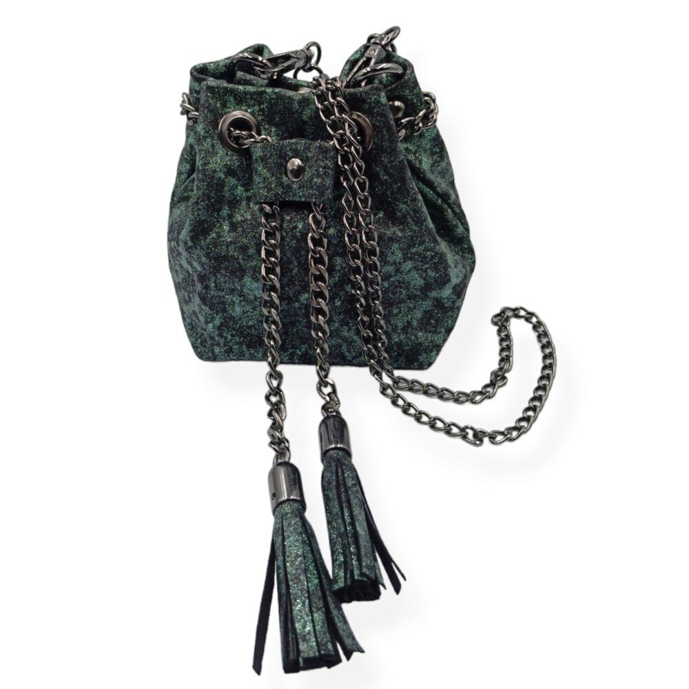 Ένα μικροσκοπικό και ιδιαίτερα στυλάτο, χειροποίητο δερμάτινο πουγκί κατασκευασμένο από γνήσιο δέρμα, Ιταλικής προέλευσης, σε μια ιδιαίτερη πράσινη απόχρωση. Διαθέτει 1 μεταλλική αποσπώμενη αλυσίδα της επιλογής σας: είτε μια κοντή για να το κρατάτε στο χέρι είτε μια μεγαλύτερη για να το φορέσετε στον ώμο ή χιαστί. Είναι διακοσμημένο με εντυπωσιακές αλυσίδες και 2 δερμάτινες φούντες στο τελείωμα, δίνοντας του λάμψη και κίνηση. Κλείνει με μαγνητικό κούμπωμα και το εσωτερικό του είναι επενδυμένο με βαμβακερή φόδρα. Εσωτερικά διαθέτει μια μικρή δερμάτινη θήκη για περισσότερη οργάνωση. Το μέγεθός του είναι εξαιρετικά μικρό, χωράει μόνο τα απολύτως απαραίτητα, όπως ένα κλειδί, ένα κραγιόν και μια κάρτα.