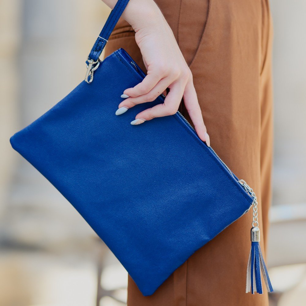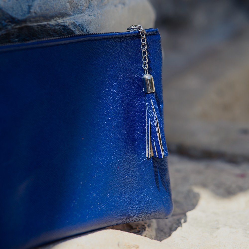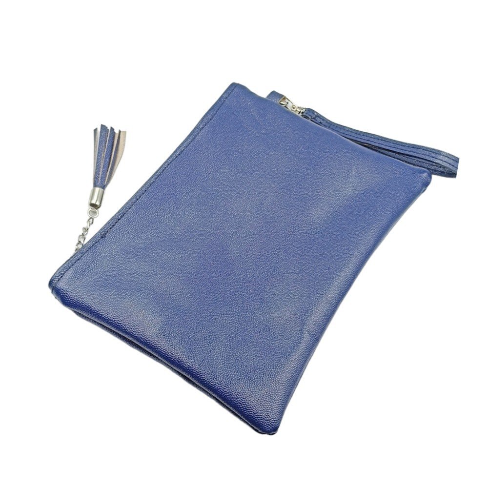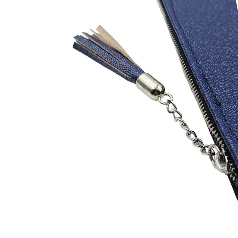 Αυτός ο χειροποίητος δερμάτινος φάκελος σε εντυπωσιακό μπλε χρώμα είναι ένα απαραίτητο αξεσουάρ για κάθε περίσταση. Κλείνει με φερμουάρ για περισσότερη ασφάλεια, ενώ μια κομψή λεπτομέρεια αποτελεί η διακοσμητική αλυσίδα με την φούντα. Συνοδεύεται από αποσπώμενο δερμάτινο λουράκι καρπού για εύκολη μεταφορά, αλλά μπορεί να κρατηθεί και στο χέρι αφαιρώντας το. Το εσωτερικό του είναι προσεκτικά επενδυμένο με βαμβακερή φόδρα, ενώ διαθέτει και μια μικρή δερμάτινη θήκη, ιδανική για αποθήκευση μικροαντικειμένων.