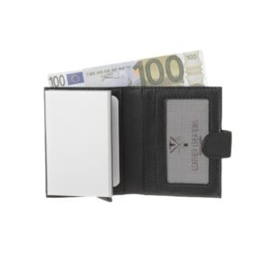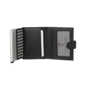 Δερμάτινο πορτοφόλι με ενσωματωμένο μεταλλικό κουτί για τις κάρτες, προσφέροντας υψηλή RFID προστασία έναντι των ανεπιθύμητων ηλεκτρονικών υποκλοπών. Εκτός του κουτιού, υπάρχει διαθέσιμη θήκη για χαρτονομίσματα, καθώς και έξτρα θήκες για κάρτες εκτός κουτιού. Υπάρχει ακόμα μια διάφανη θήκη για ταυτότητα ή δίπλωμα, ώστε να είναι άμεσα διαθέσιμα ανά πάσα στιγμή. Κλείνει με εξωτερικό κουμπί.