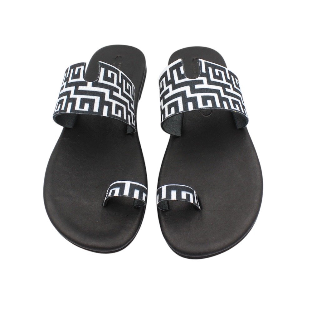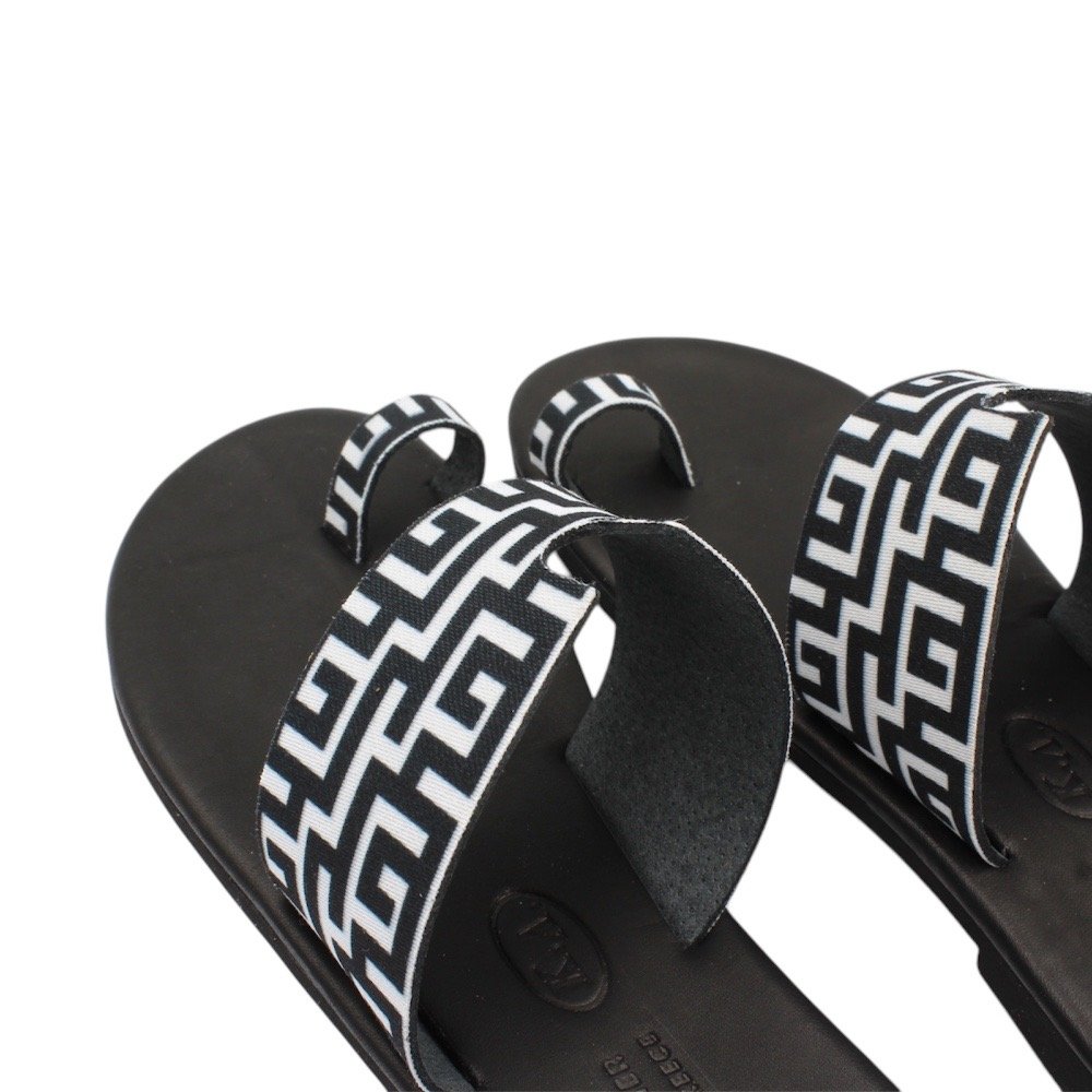 Χειροποίητα δερμάτινα σανδάλια σε μαύρο χρώμα, με λουριά που διακοσμούνται από το ελληνικό μοτίβο του μέανδρου. Ο μαλακός δερμάτινος πάτος προσφέρει άνεση όλη τη διάρκεια της ημέρας, ενώ το ιδιαίτερο σχέδιο προσθέτει αυθεντικό χαρακτήρα σε κάθε καλοκαιρινή εμφάνιση. Επιπλέον, η αντιολισθητική σόλα από καουτσουκ δίνει σταθερό βήμα και αφάλεια στο περπάτημα.